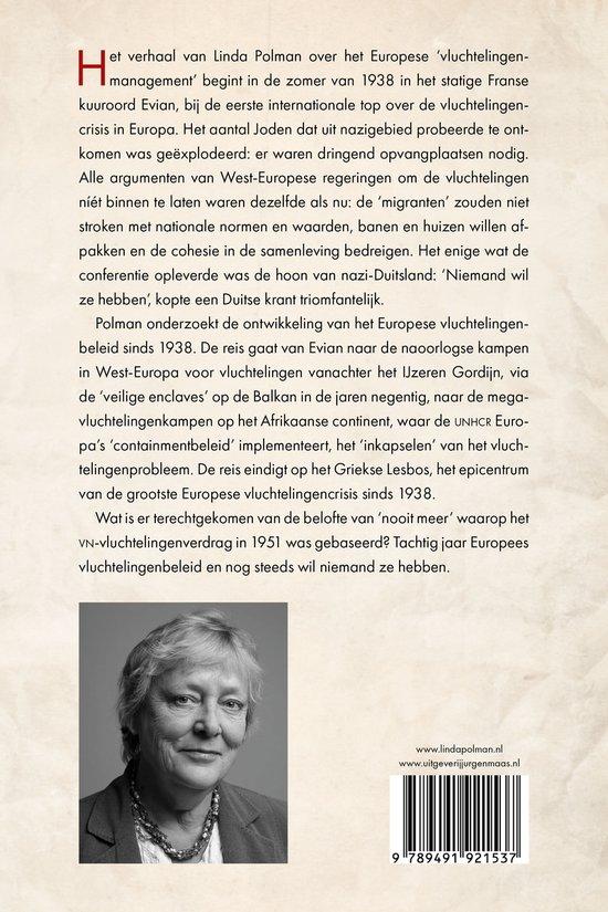 Journalist Linda Polman describes the development of the strategy in Europe's refugee policy since 1938. Drawing on her own research, experiences and conversations, she takes the reader on a voyage starting at Evian, over the post-war camps in Western Europe for refugees fled from behind the Iron Curtain and the 'safe enclaves' for refugees in the Balkans in the 1990s, to the dozens of Europe-funded UNHCR refugee camps now in Africa. She outlines, among other things, the stranglehold that Europe has on the UNHCR. The UN organization, which has to stand up for the rights of millions of refugees around the world, is financially wholly dependent on European donor governments and is therefore subject to Europe's whims.